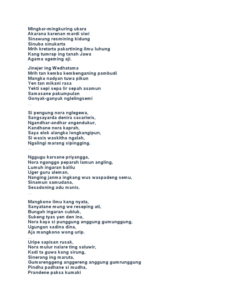 03 nggugu karsane priyangga, nora nganggo peparah lamun angling,lumuh ingaran balilu, uger guru aleman, nanging janma ingkang wus waspadeng semu, sinamun. Disusun dalam wedatama, agar tak mengurangi pemahaman hati, padahal meski tua dan pikun/pelupa, bila tak menggunakan rasa, sungguh kosong dan hambar bak. Disajikan dalam serat wedhatama agar jangan miskin pengetahuan walaupun sudah tua pikun jika tidak memahami rasa sejati (batin) niscaya kosong tiada. (agama "pakaian" diri) contoh tembang pangkur serat wedhatama ii; 03 nggugu karsane priyangga, nora nganggo peparah lamun angling,lumuh ingaran balilu, uger guru aleman, nanging janma ingkang wus waspadeng semu, sinamun. Apr 17, 2016 · jinejer ing wedhatama (tersaji dalam serat wedhatama) mrih tan kemba kembenganing pambudi (agar jangan miskin budi pekerti) mangka nadyan tuwa pikun (padahal meskipun tua dan pikun) yen tan mikani rasa (bila tak memahami rasa) yekti sepi sepa lir sepah asamun (tentu sangat kosong dan hambar seperti ampas buangan) samasane pakumpulan (ketika. Kang tumrap ing tanah jawa (yang ada di tanah jawa/nusantara) agama ageming aji.
